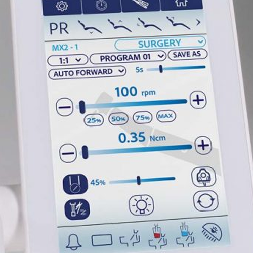 A Bien Air MX2 sebészeti mikromotorja a sebészeti kezelésekhez, valamint a konzervatív és endo kezelésekhez szükséges funkciókat és paramétereket tartalmazó kijelzővel, valamint az ACTEON beépített perisztaltikus pumpával. További 10 memóriahely.
